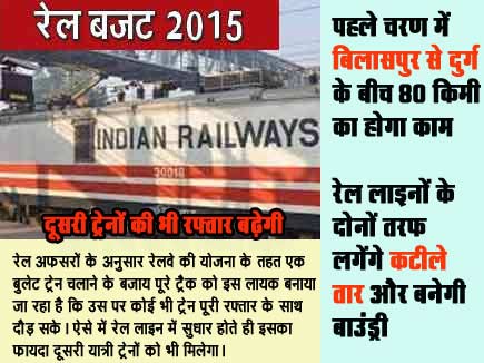 बिलासपुर- नागपुर के बीच पिछले रेल बजट में घोषित सेमी बुलेट ट्रेन को इस बजट में हरी झंडी मिल गई है। पहले चरण में बिलासपुर-दुर्ग के बीच ट्रैक को बुलेट ट्रेन दौड़ाने लायक बनाया जाएगा। इसके लिए बजट में 975 करोड़ रुपए का प्रवाधान किया गया है। इस पैसे से दोनों स्टेशनों के बीच की करीब 80 किमी के रेलवे ट्रैक की फेंसिंग और बैरिकेडिंग की जाएगी।